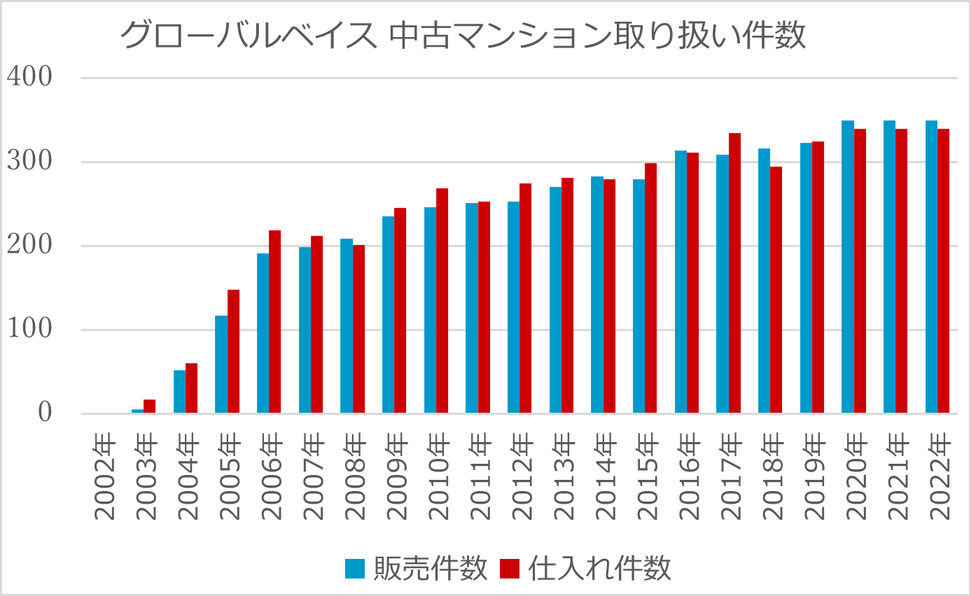 当社は2002年より都心好立地を中心に、中古マンションの仕入れ、販売を行ってまいりました。創業当時は数件ほどだった物件調達件数、販売数ともに右肩あがりで成長し、現在では毎年400戸以上の中古マンションの仕入れ、リノベーション施工、販売を行っています。