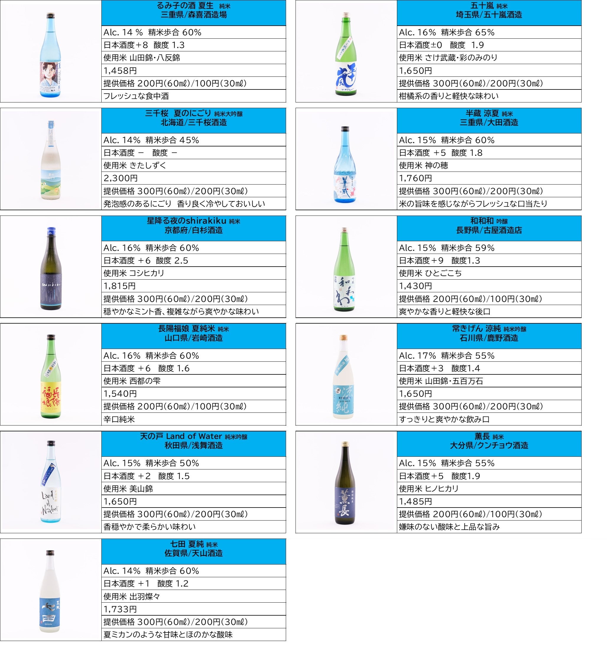 『夏酒』とは、様々な酒蔵が提案する“冷やして楽しむ日本酒”を総称しており、これから暑くなる季節に飲む”旬のお酒”として人気を集めています。冷やしてすっきり飲めるフルーティーな香りの酒をはじめ、爽やかな香りで軽快な飲み口、発泡感のある酒など、バラエティ溢れる味わいとともに涼しげで夏らしいラベルデザインも『夏酒』の魅力とともに楽しむことができます。