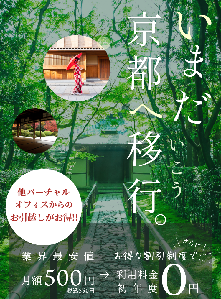 内容:バーチャルオフィスを他社より京都市(京都朱雀スタジオ)へお引越しされる⽅の