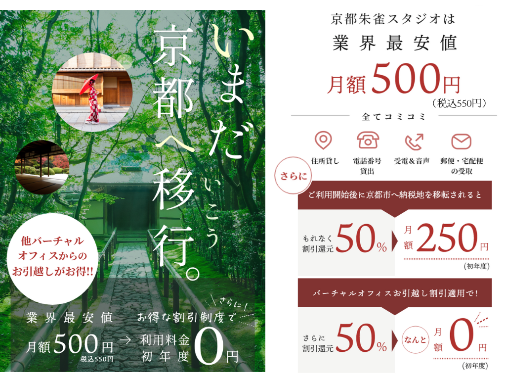 - 既に他社バーチャルオフィスサービスをご利用中の方には、京都朱雀スタジオへお引越し頂くことで、初年度利⽤料が半額(50%割引還元)となる「バーチャルオフィスお引越し割引」を開始しました。