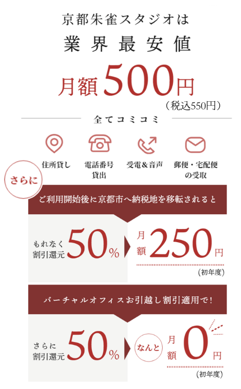 ご自身のビジネスを成長させるために、継続的に発生するコストの削減を行い、その資金をビジネスの成長に投資する予算にされてはいかがでしょうか?京都朱雀スタジオのご利用料金は、わずか月額500円, 年間6,000円(税込:月額550円, 年間6,600円)です。さらに割引適用で、お得に利用できます。