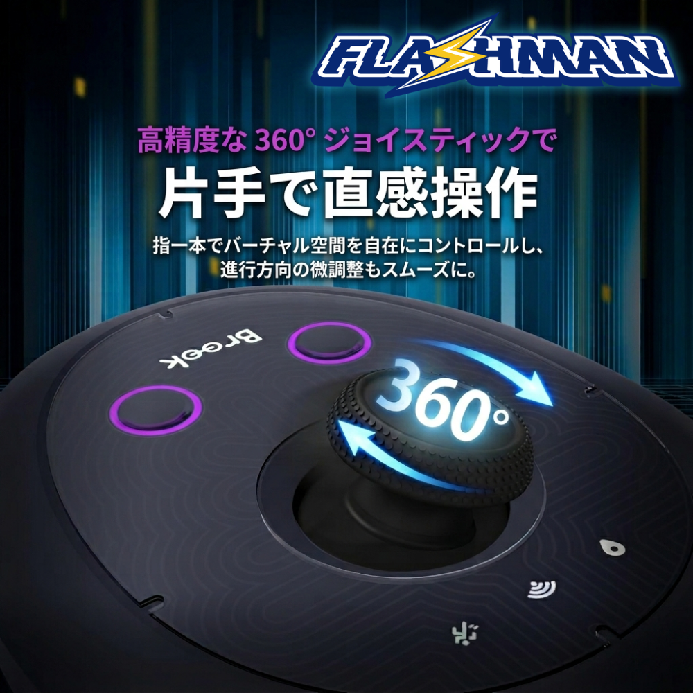Flashmanの最大の特徴は、高精度な360°ジョイスティックです。指一本でバーチャル空間を自在にコントロール。進行方向の微調整もスムーズで、複雑な地形での細かい移動も思いのままです。画面を見ながら、ジョイスティックで直感的に操作するだけで、まるで実際にゲーム世界を歩いているかのような没入感が得られます。スマートフォン操作から完全に解放され、友人との会話や周囲の風景も同時に楽しめるのです。