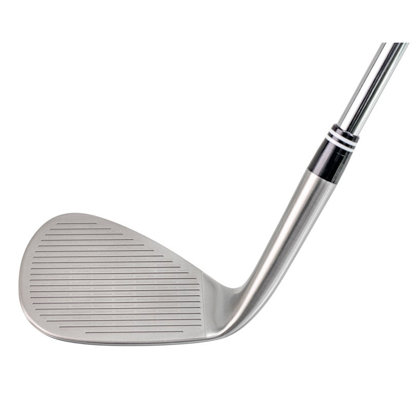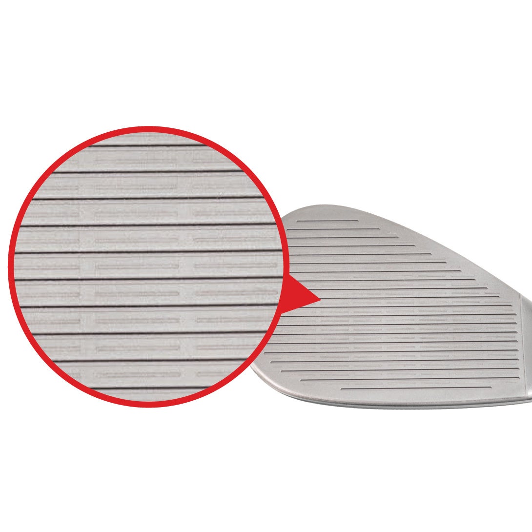 フェース面全体に及ぶスコアライン (フルスコアライン) と溝間の加工 (レーザーリブ) を採用することで、 ルール適合ながら、フルショットはもちろんフェースを開いた時にトウ側でヒットしても、確実にスピンが得られます。さらにフェース面が大きく見えて優しく感じる効果もあります。