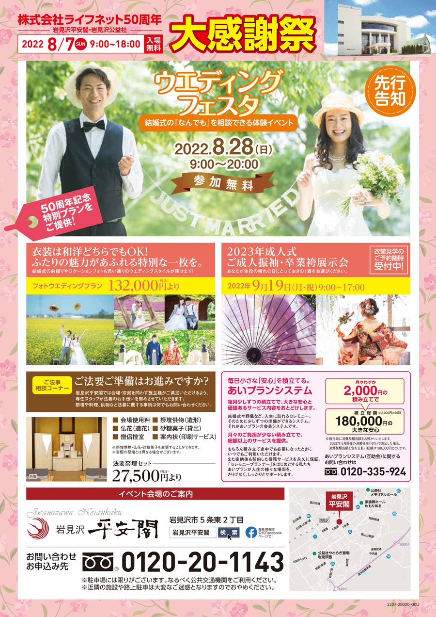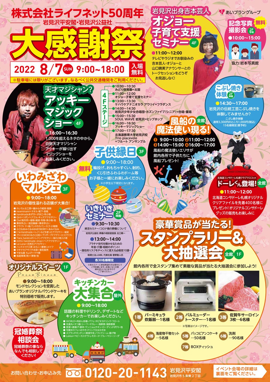 あいプラングループの株式会社ライフネットが創立50周年を迎えます。50周年を記念して、2022年8月7日(日)に岩見沢平安閣(岩見沢市)にて『大感謝祭』を開催いたします。地域の皆様へご愛顧の感謝を込めて、またご家族で笑顔になっていただける1日として様々な催しをご用意しております。