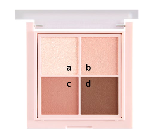 4. 細いブラシで左下(c)を下まぶたのキワ全体に入れて、黒目より目尻側は右下(d)を。