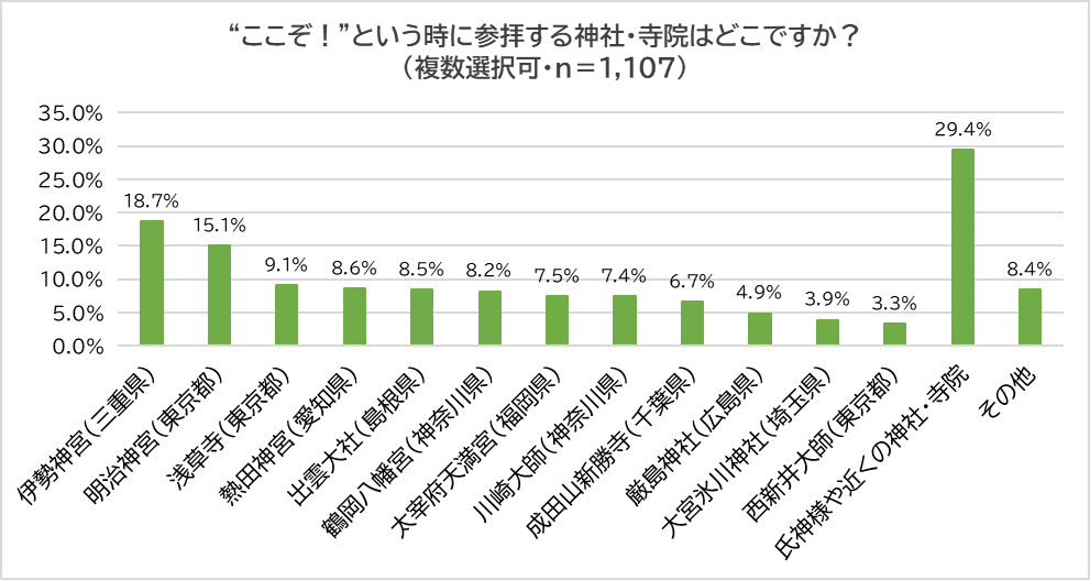 次に、「“ここぞ!”という時に参拝する神社・寺院はあるか?」と聞き、「ある」(37.0%)と回答した1,107人に、「その神社・寺院はどこか?」聞きました。3割(29.4%)が「氏神様や近くの神社・寺院」と回答しましたが、それ以外では「伊勢神宮(三重県)」(18.7%)、「明治神宮(東京都)」(15.1%)、「浅草寺(東京都)」(9.1%)など、参拝者数も非常に多く、世界的にも有名な神社・寺院が目立ちました。