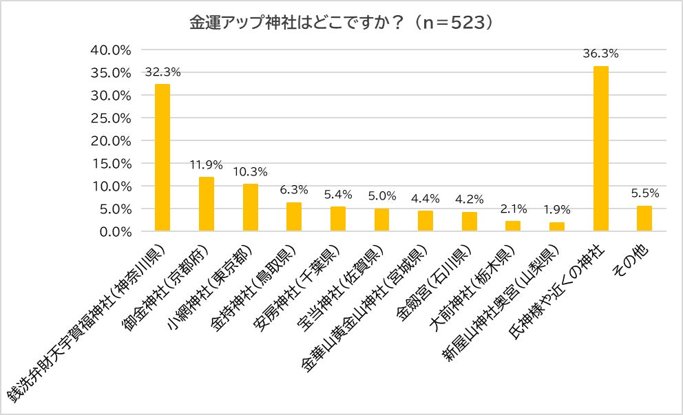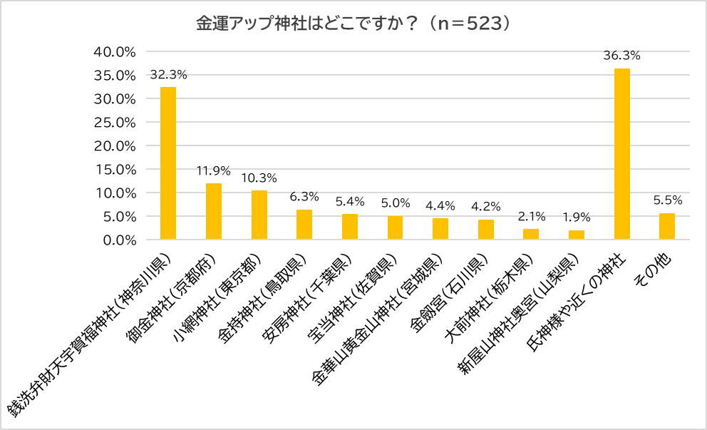 続いて、「金運アップ神社はあるか?」と聞き、「ある」(27.3%)と回答した523人に、「金運アップ神社がどこか?」聞きました。1位は「銭洗弁財天宇賀福神社(神奈川県)」(32.3%、昨年:19.9%)、2位は「御金神社(京都府)」(11.9%、昨年:17.7%)、3位は「小網神社(東京都)」(10.3%、昨年:12.7%)となり、トップ3は昨年と同じでした。また、一般的に日本三大金運神社と言われている、「安房神社(千葉県)」(5.4%、昨年:9.9%)は昨年の4位から5位に1ランクダウン、「金劔宮(石川県)」(4.2%、昨年:5.9%)は昨年同様の8位、「新屋山神社奥宮(山梨県)」(1.9%、昨年:3.5%)も昨年同様10位でした。