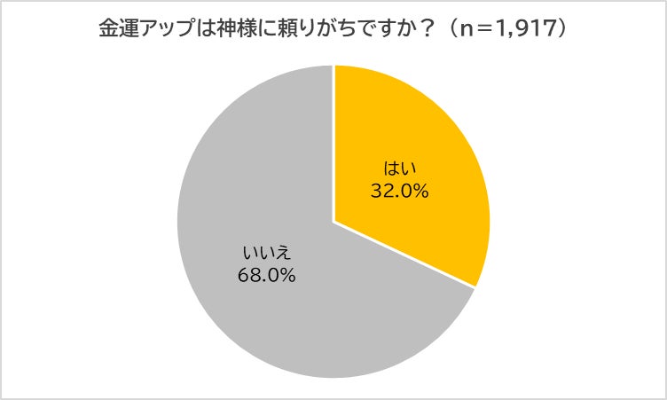 「2024年は金運を上げたい」と回答した1,917人に、「金運アップは神様に頼りがちか?」と聞いたところ、3割超(32.0%)が神頼みしていることがわかりました。