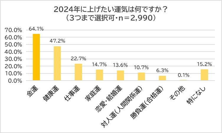 「2024年に上げたい運気は何か?」と聞いたところ、最多は「金運」(64.1%)となり、「健康運」(47.2%)、「仕事運」(22.7%)、「家庭運」(14.7%)、「恋愛・結婚運」(13.6%)と続きました。また、欲がない人も15.2%いました。