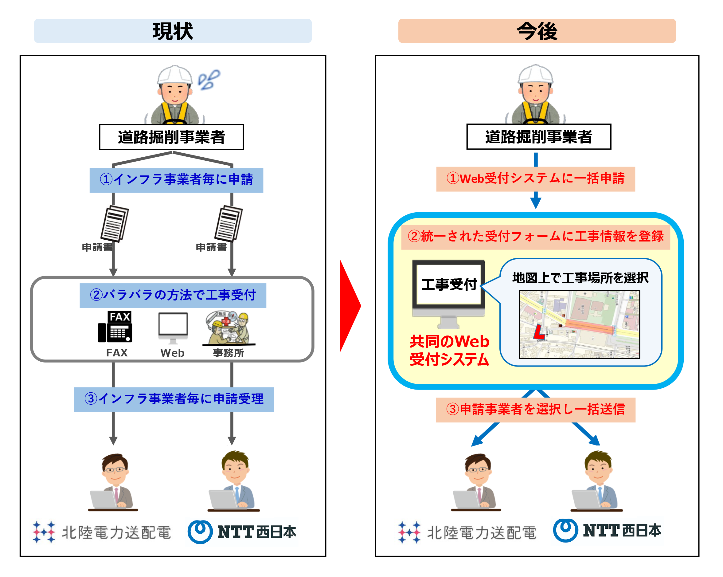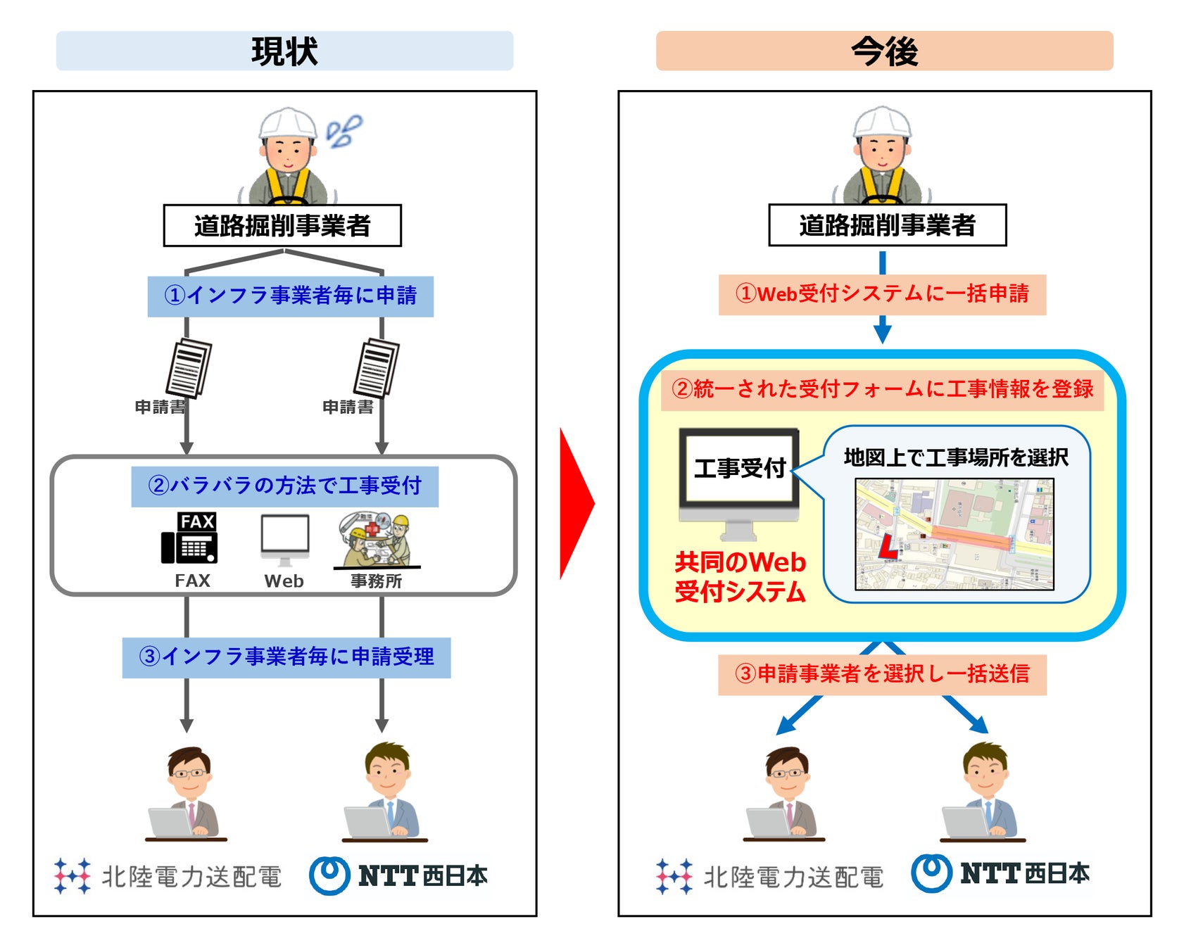 この度、北陸電力送配電およびNTT西日本は、北陸エリアで初めて、工事会社が複数のインフラ事業者に一括で申請出来るよう、本Webシステムを利用した共同受付を開始します。これにより工事会社は申請作業の利便性が向上し、両社は申請受付業務を効率化します。