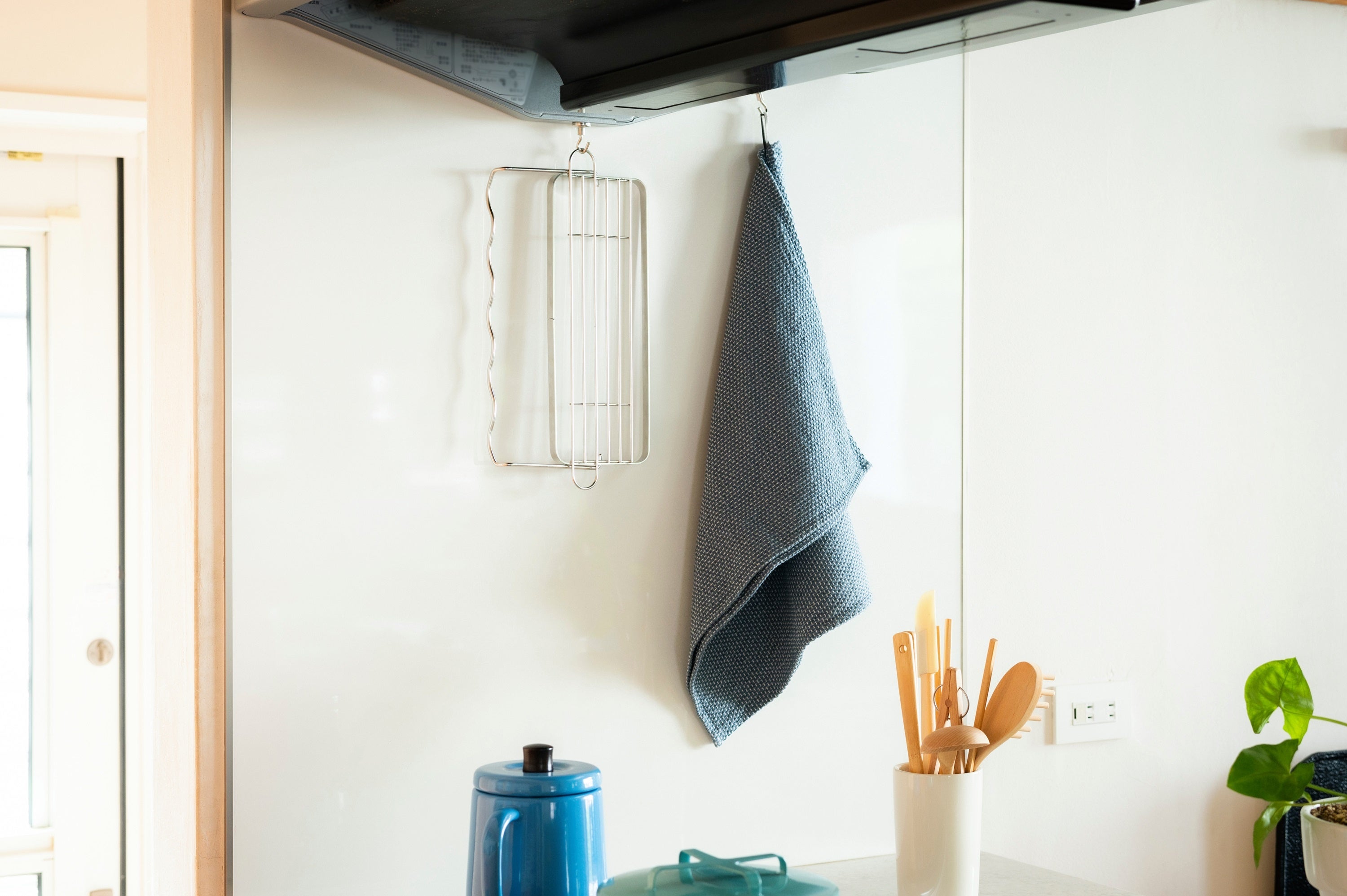吸水タオルの上に置いて使うことで、常に置いておかず、使いたい時だけサッとだして、使わないときは引っ掛けて片付ける。