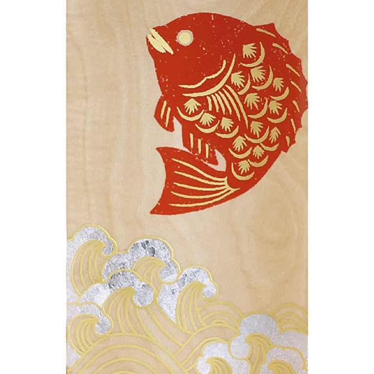 ◎図柄のポイント…金粉・アルミ箔で仕上げた波、幸運を象徴する朱色の鯛
