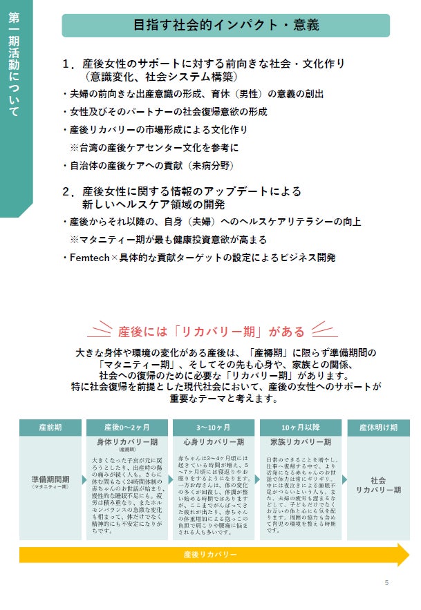 「産後リカバリー白書」は、出産や子育てに関連する商品・サービスを展開する企業様への、出産後の女性や夫婦の理解からのマーケティング支援や、自治体や地域のコミュニティー、そして出産に関わる様々な方々への、新たな気づきと理解を促したい思いから作成をしております。今後、「産後リカバリープロジェクト」賛同・協賛企業様、後援団体様への会員特典として、配布や販売を行っていく予定です。