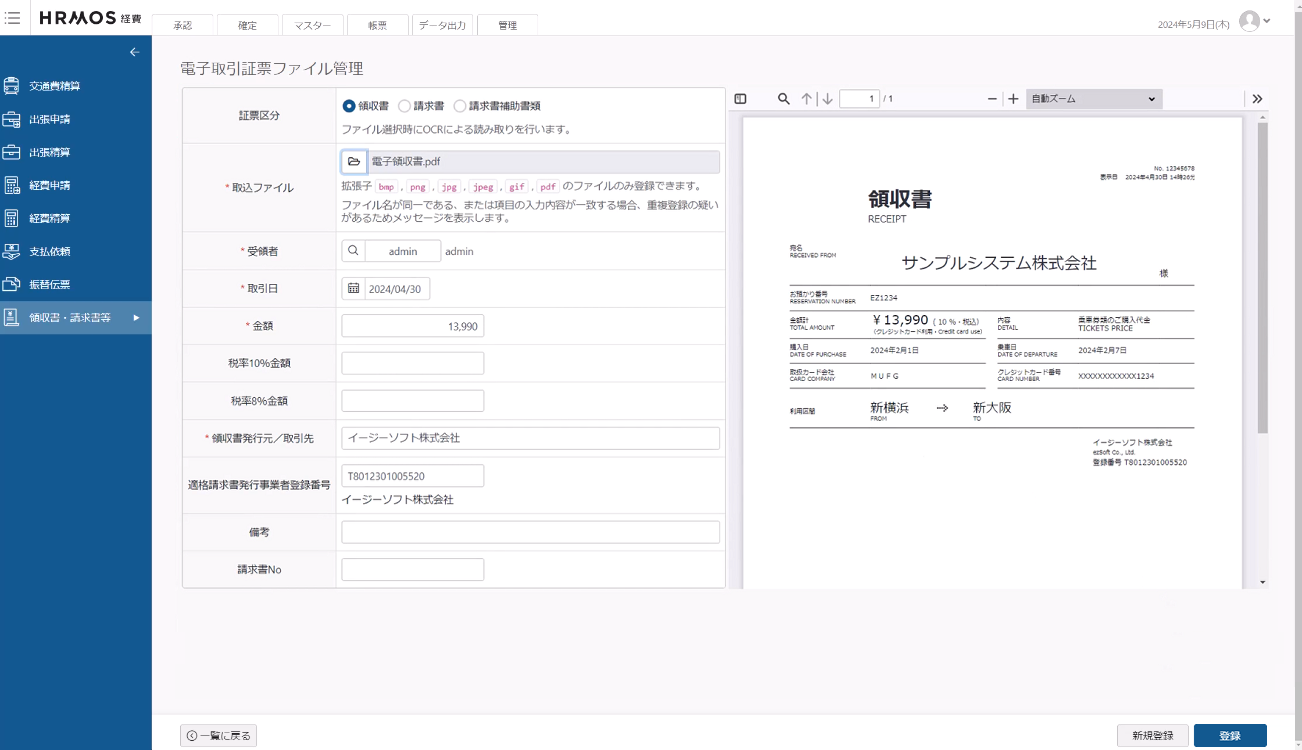 紙の領収書だけではなく、電子取引の領収書も読み取り可能になり、電子帳簿保存法に対応した電子保存も容易に。正確な読み取りにより、申請時の手入力を削減し、作業時間の短縮と経費精算業務の効率化を促進します。