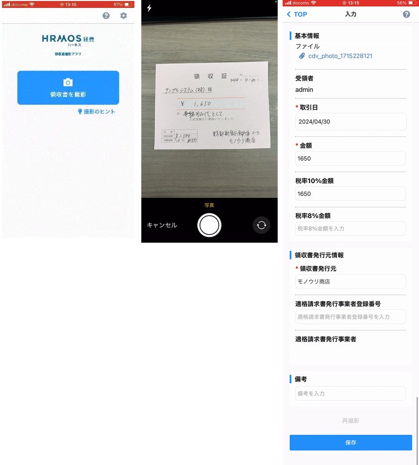 またハーモス経費は、直感的に操作できるシンプルな画面と連続撮影機能を備えた領収書撮影アプリを提供しています。このアプリを使用することで、スマートフォンやタブレットを使って紙の領収書を撮影し、経費の即時処理を可能にしています。AIによる自動データ認識により、経費精算プロセスを改善します。