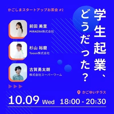 テーマは「学生企業、どうだった?」。前回も好評だった「かごしまスタートアップお茶会」の第2回で、MIRAERA株式会社代表の前田美里さん、株式会社スーパーワームの古賀勇太朗さんを登壇者としてお招きいたします。また、Kyushu Startup Gateway の一員であるTooon株式会社代表・杉山がモデレーターを務めます。