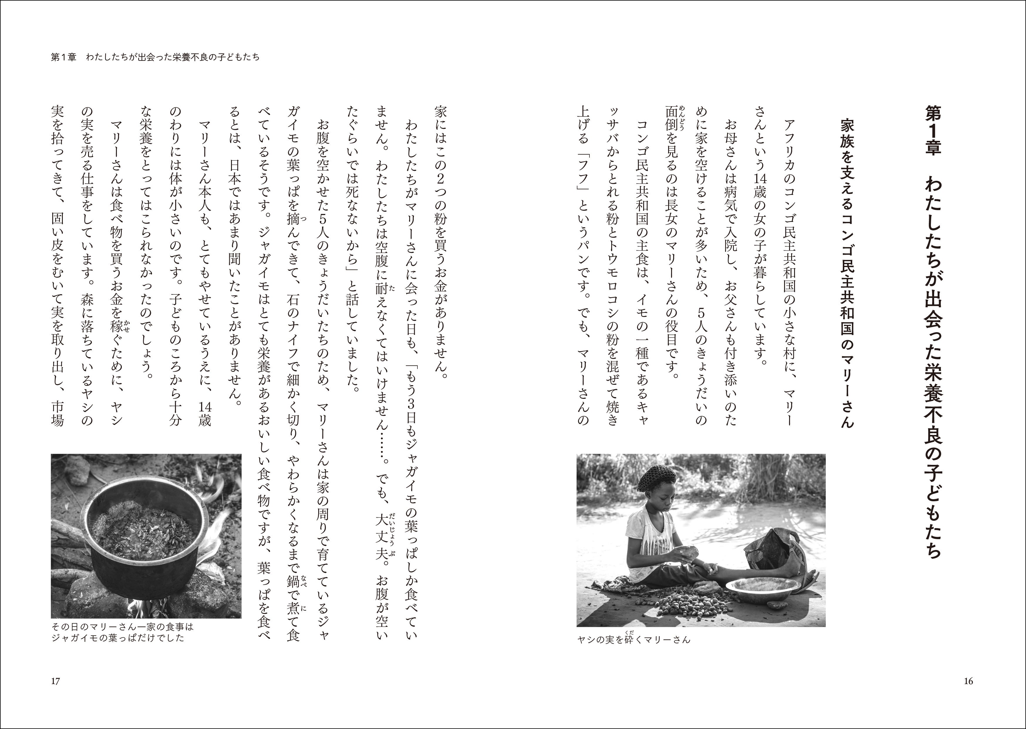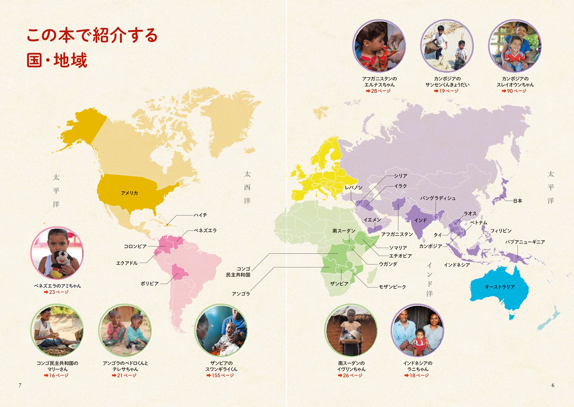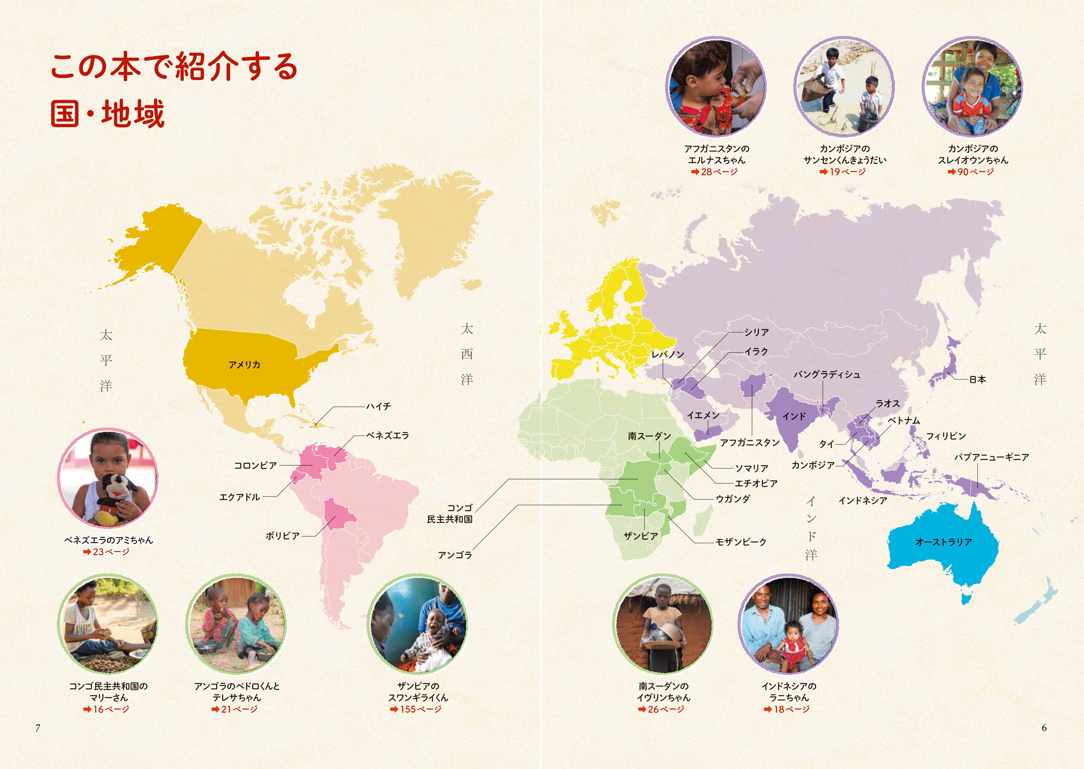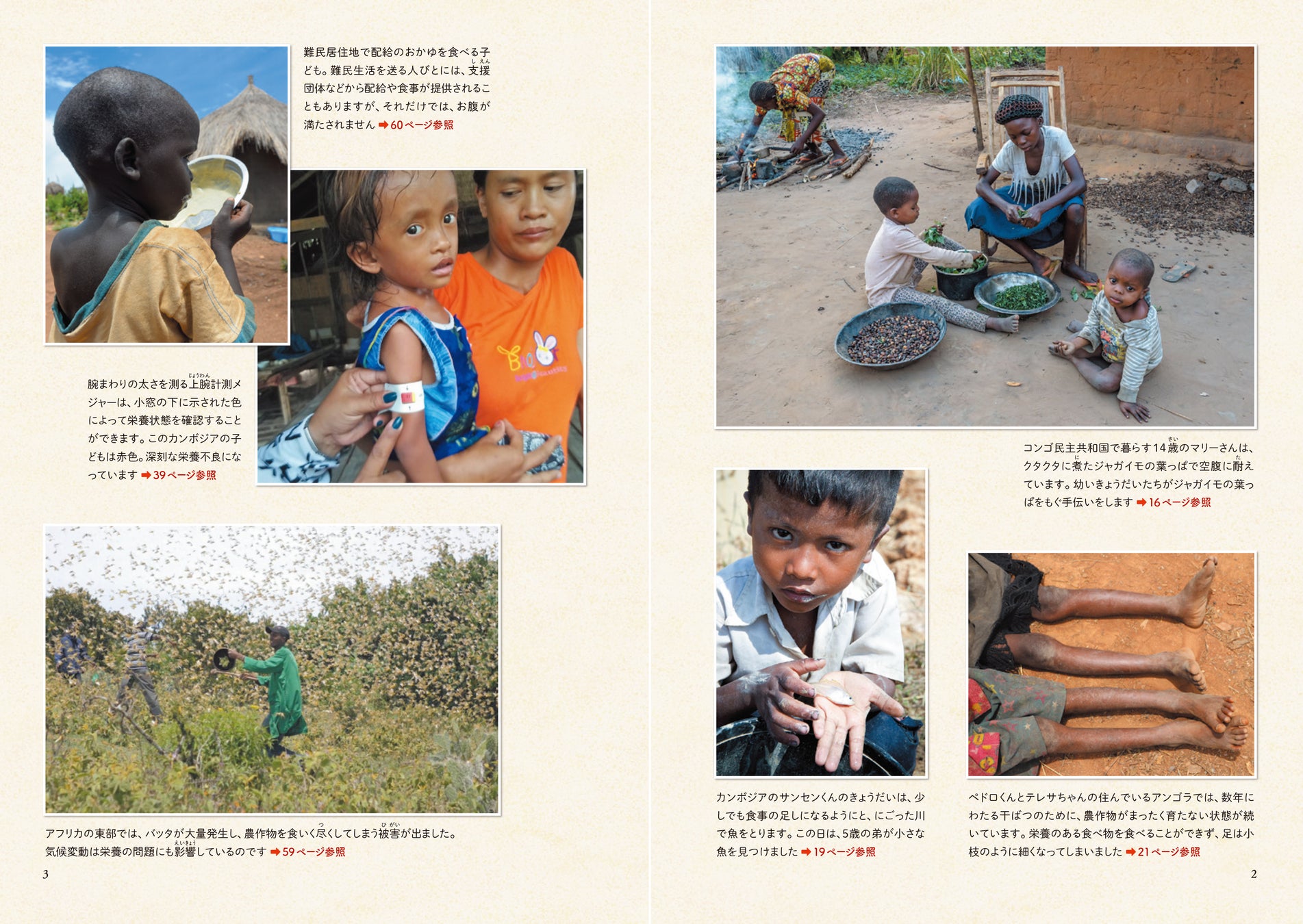 - 口絵ページでは、実際の栄養不良の子どもたちや、支援により改善された地域、人びとの写真、本書に登場する国・地域を示した地図を掲載。