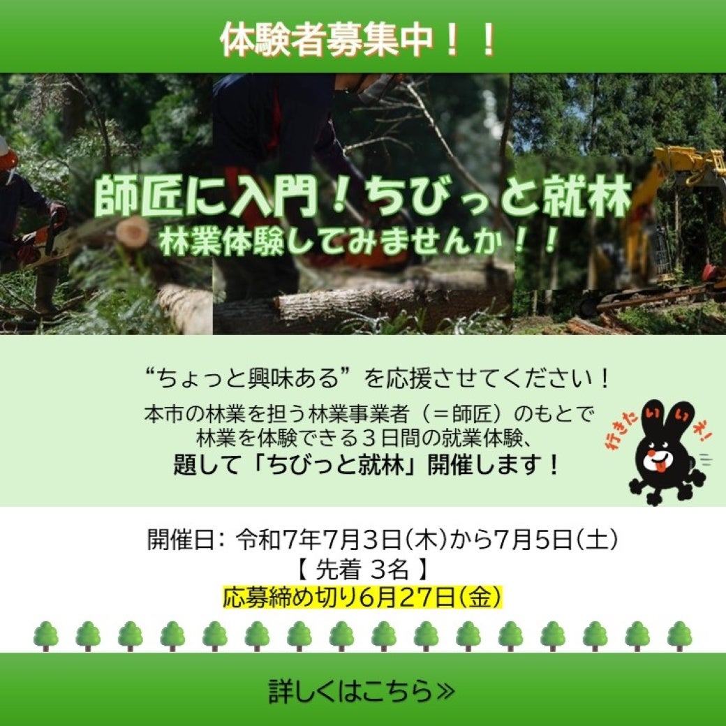 福井市では本年度より、減少傾向にある林業の担い手確保に向け、新事業としてプロのもとで体験できる3日間の就業体験プログラム、題して「ちびっと就林」事業を始動します。