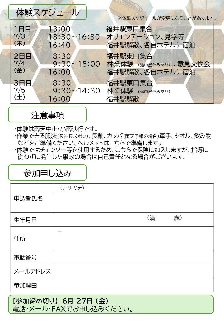 自然×仕事のリアルを体感。”福井市で林業”という新しい選択。林業の師匠が教える3日間(7/3~7/5)の林業体験「ちびっと就林」体験者募集中!!【先着3名】県外在住の方には、交通費・宿泊費助成します!
