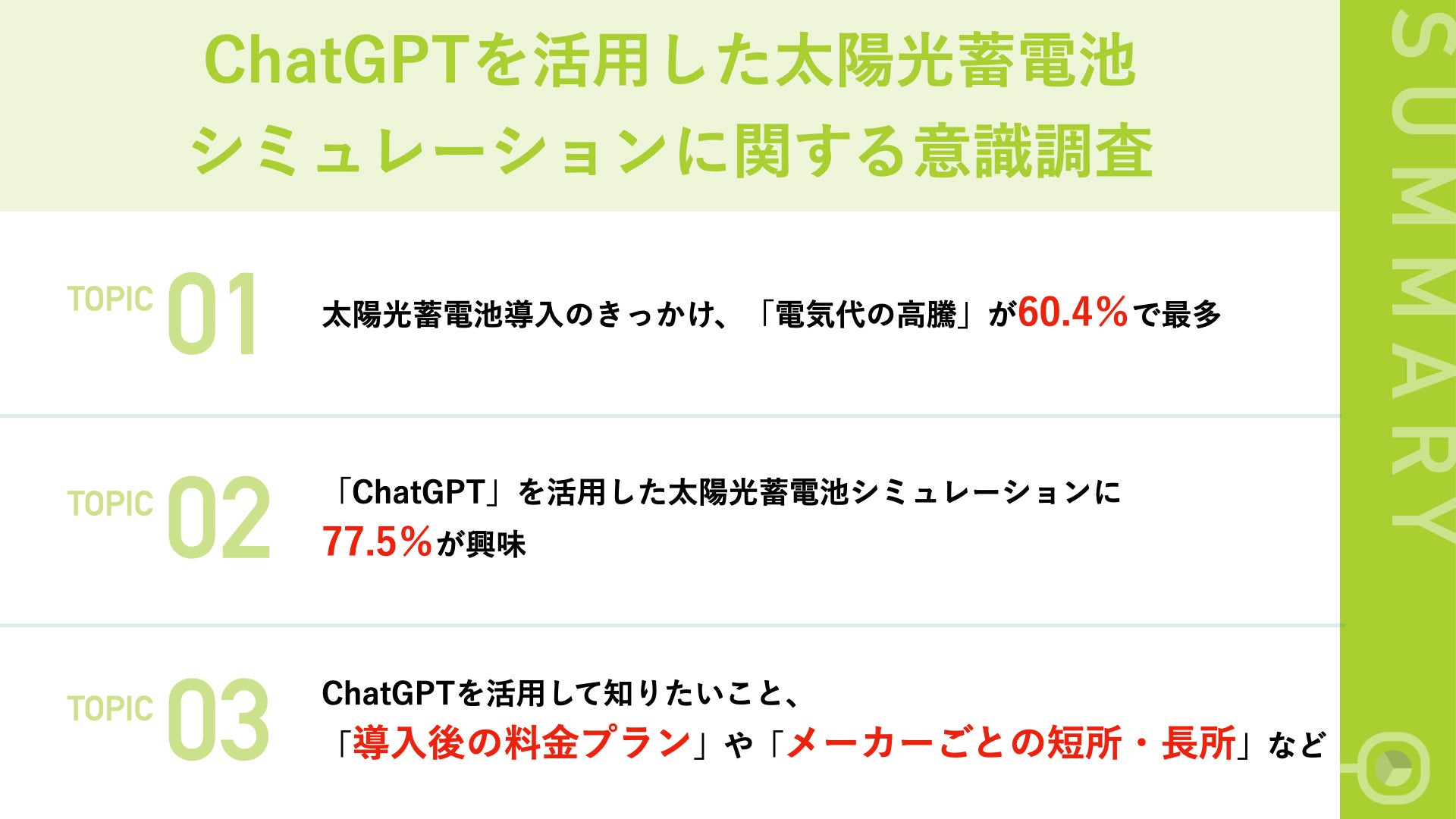 今回の調査では、高価な投資となる太陽光蓄電池を導入する上で、ChatGPTを活用した太陽光蓄電池シミュレーションに期待が寄せられている実態が明らかとなりました。まずは「導入後の電気料金プラン」や「メーカーごとの短所・長所」などについて気軽に質問したいという声が多く寄せられ、恣意が入り込む余地のないデータから回答を得ることによって、様々な選択肢から最適な方法を知りたいという本音を垣間見ることができました。ChatGPTの実用化に、ますます注目が集まると言えるでしょう。