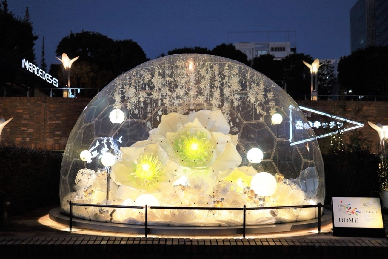 敷地内中心に位置する「ITOCHU SDGs STUDIO DOME(ドーム)」ではSDGsがテーマのアート・インスタレーションを展開。今回第四弾となる作品は、第三弾に引き続きジャイアントフラワーアーティストのMEGUさんとコラボレーション。「冬の道しるべ」をテーマに、純白に輝き、凛と咲き誇るクリスマスローズのジャイアントフラワーアートを公開しています。