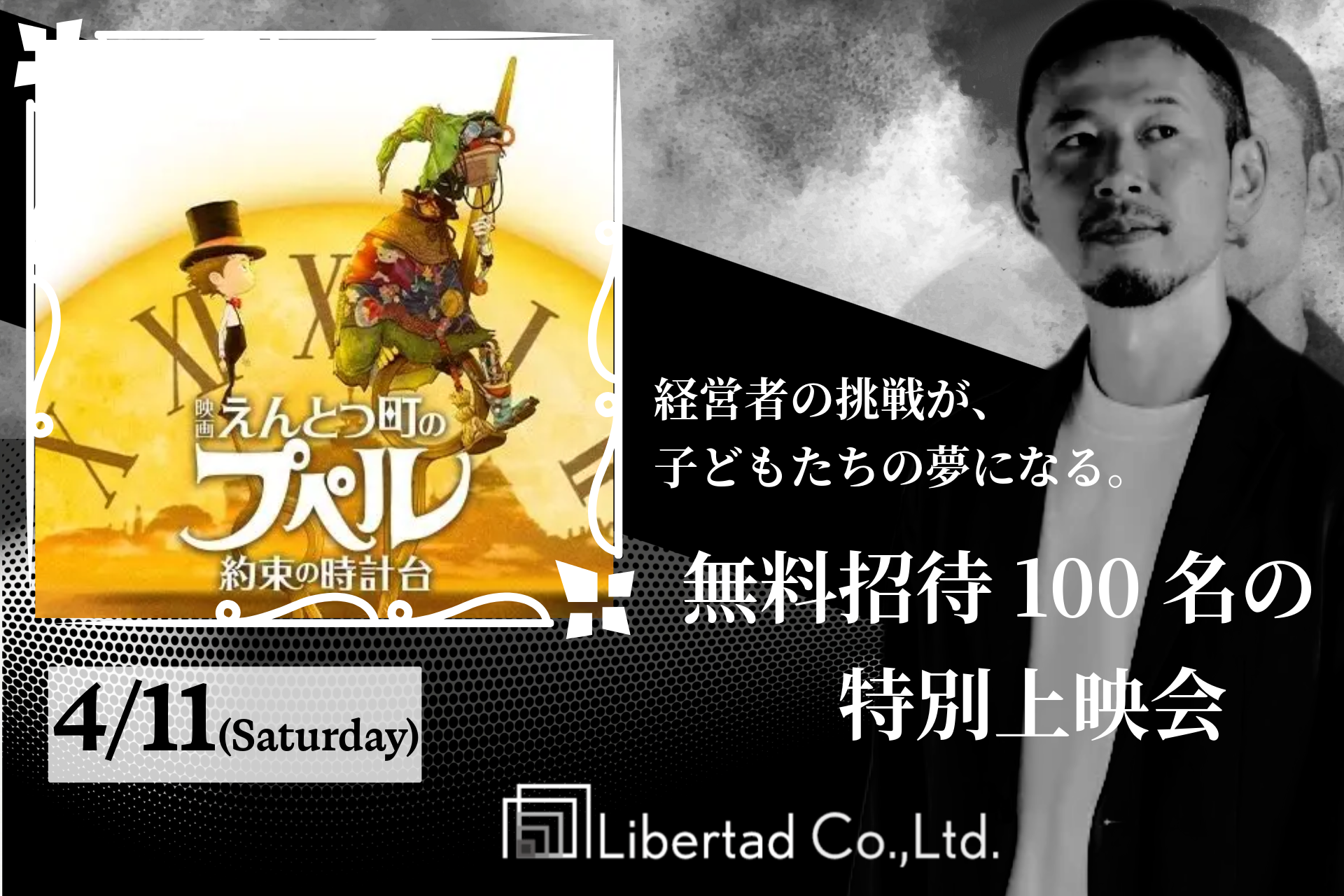 「経営者に、数字に縛られない真の自由を」をコンセプトに掲げ、オンライン経営改善・資金繰り支援サービスをはじめとした中小企業支援を行う株式会社リーベルタッド(本社:茨城県守谷市、代表:市ノ澤 翔)は、2026年4月11日(土)に成田HUMAXシネマズにて開催される『映画 えんとつ町のプペル 〜約束の時計台〜』貸切上映会へ協賛することをお知らせいたします。