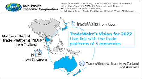 トレードワルツは過去2018~2019年にかけてシンガポールやタイで行った海外実証を通じ、貿易情報連携プラットフォーム(以下:PF)「TradeWaltz」を、海外展開あるいは海外貿易PFを連携することで、相手国の貿易手続きを 60%効率化することに資すると確認しています。本事業は、その結果を基に、インド太平洋地域でのサプライチェーンを更に強靭化すべく、2021年5月11日にニュージーランド開催された国際会議 APEC2021ワークショップにて、トレードワルツより提案したものです。TradeWaltz(日本)-NTP(シンガポール)-NDTP(タイ)-TradeWindow(オーストラリア、ニュージーランド)という5カ国の貿易PF間をシステム連携し、通関の元情報となる実ビジネスの商流電子データを連携していくことで、通関業務をより効率化できることを実証します。本事業は、2022年APEC議長国のタイがナショナルプロジェクトとして進めるプロジェクトとなっており、成果はAPEC2022首脳会議(2022年11月14日)で発表を計画しています(※1)。