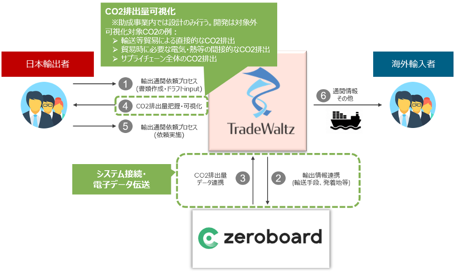 また、各貿易事業者における脱炭素経営方針に沿った事業運営を可能とするべく、事業・サプライチェーンで排出されるCO2を計測するソリューション zeroboard と TradeWaltz を連携し、各貿易におけるCO2排出量を捕捉できるよう試みます。(※東証プライム上場企業は特にサプライチェーン上の排出量/GHGプロトコル Scope3の計測が促されています。 https://newswitch.jp/p/31215)