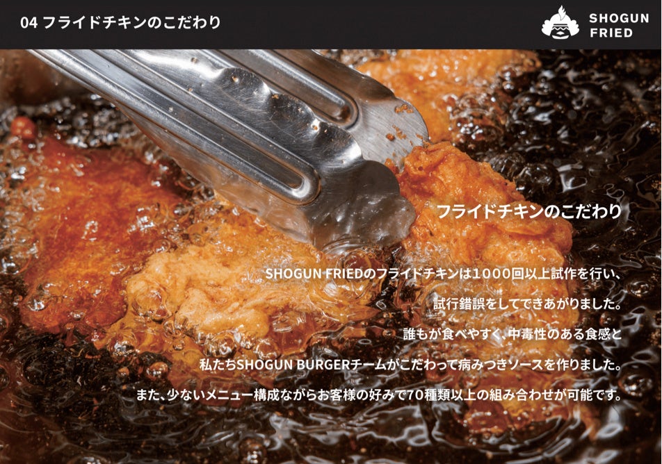 先日 Japan Burger Championship で日本一を獲得し、今年11月には世界へ挑戦することが確定している「SHOGUN BURGER」ですが、そちらのメインシェフを務める扇谷が1000回以上の試作を行い、 試行錯誤をして出来上がったのがこちらの本格フライドチキンとポテトの専門店【SHOGUN FRIED】です。