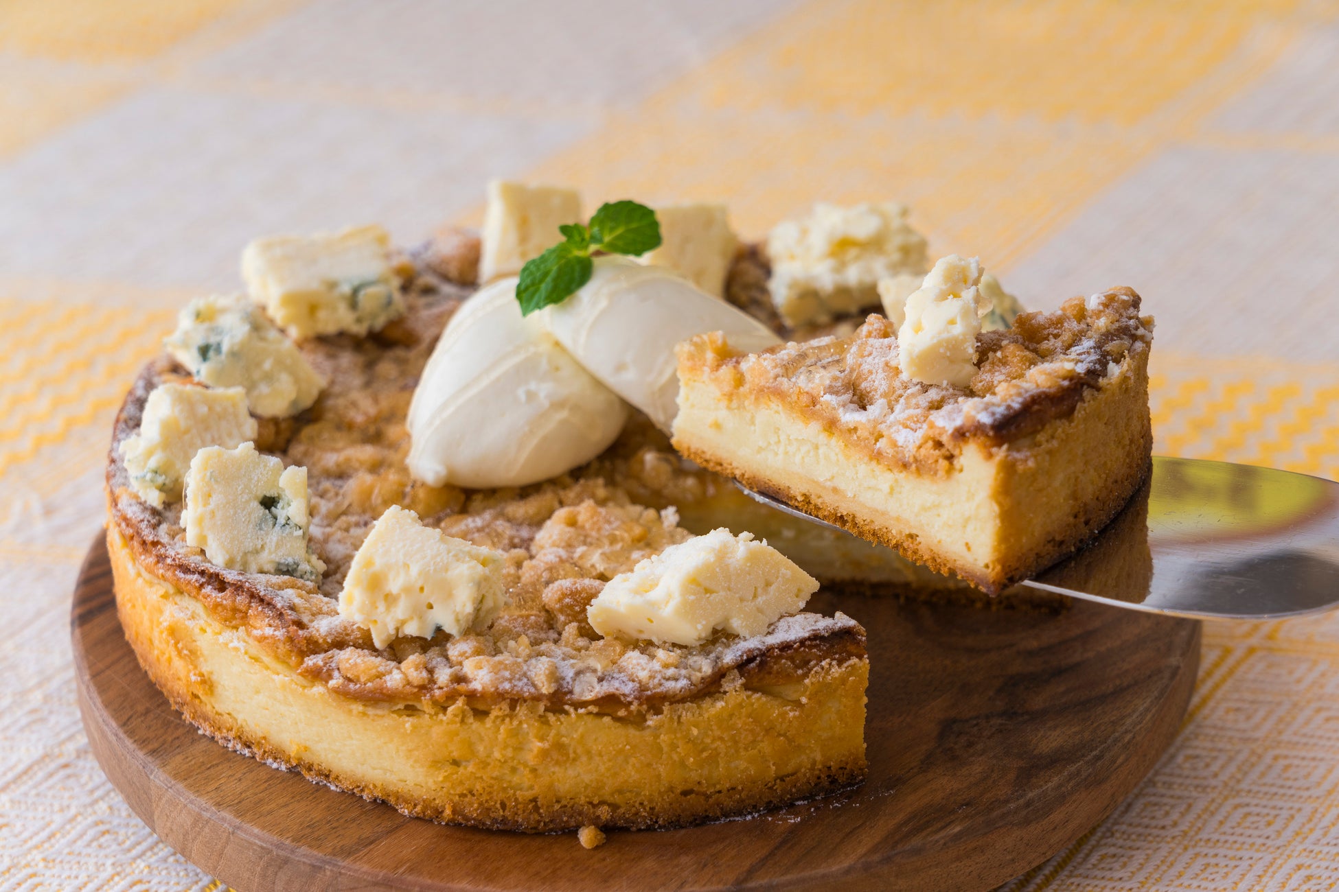 チーズ好きの方に特に味わっていただきたいのがシェフイチ押し「チーズホリック ベイクドケーキ」です。ブルーチーズのほのかな塩味とはちみつ、たっぷりのアーモンドクランブルと爽やかなマスカルポーネクリームチーズの相性が抜群です。