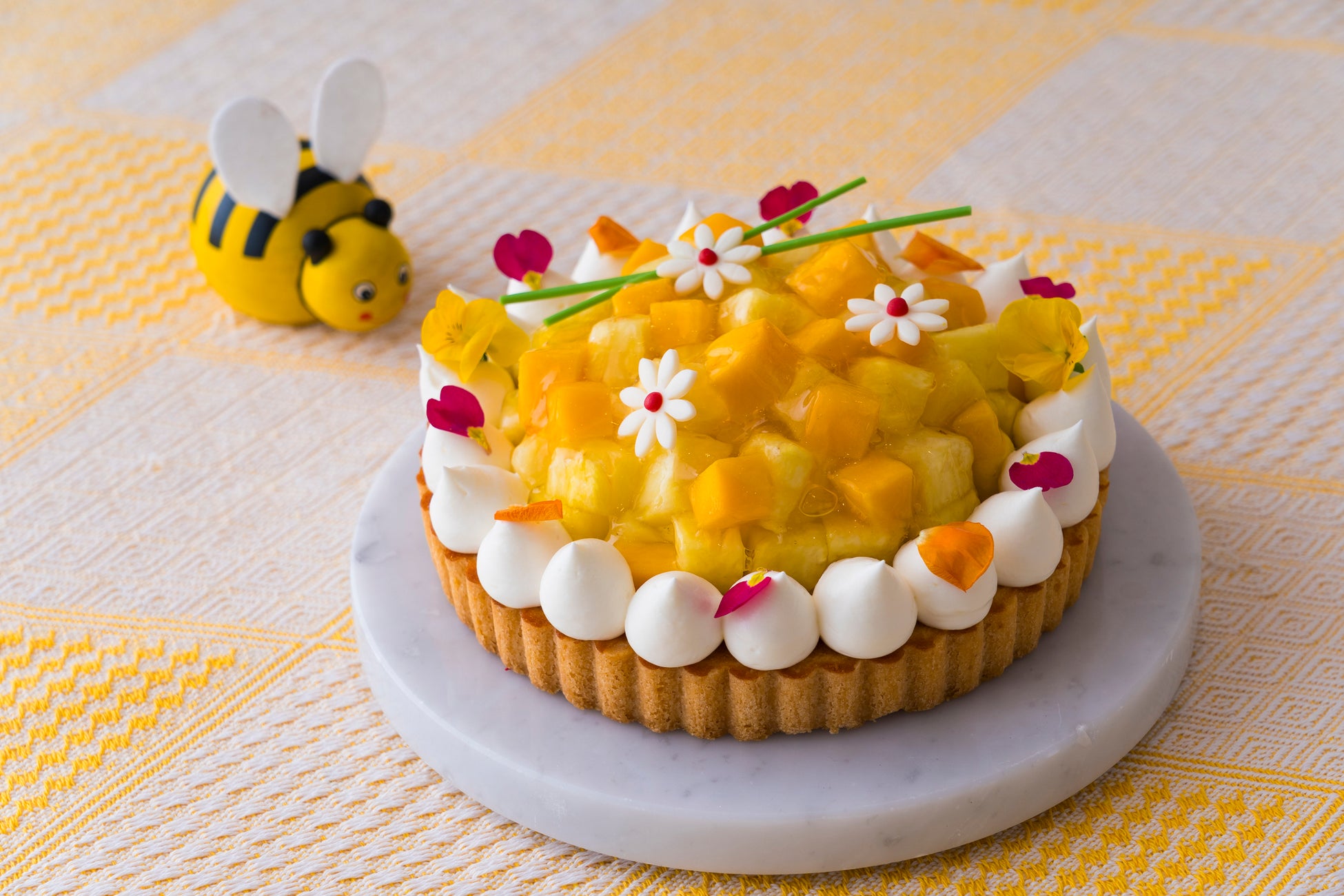 その他にもアーモンドタルトにたっぷりのマンゴーとパイナップルをトッピングし、はちみつのジュレでコーティングした「ハチさんも間違えるフラワータルト」、レモン果汁とレモンゼストと共にしっとりと焼き上げたパウンドケーキにオレンジなどのフルーツとミントを配した「レモンリースのパウンドケーキ」など、愛らしいスイーツの数々がビュッフェ台を彩ります。