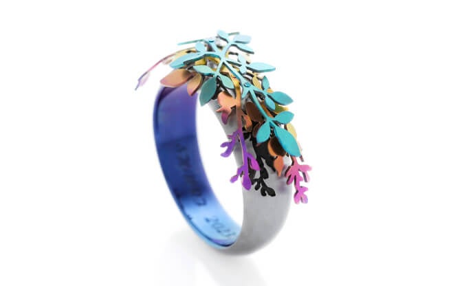 この度、プラスエンジニアリング株式会社の強みである精密機械加工技術と、有限会社ソラ(SORA)が得意とするレアメタルの発色加工技術を融合させることにより、新しい宝飾品の表現に挑戦しました。作品に使用しているレアメタルのジルコニウムは、兼ねてよりSORAが指輪の素材として使用している金属ですが、素材の硬度や溶解温度の高さから、加工の難易度が高く、人の手による加工が不可欠な素材でした。そのため、緻密なデザインを表現するには加工技術の限界がありました。この度、このコンテストにエントリーすることで、異なる業種との連携により、宝飾品のレアメタル加工技術に新たな可能性を見出しました。今後もSORAは、この可能性を活かし加工技術の幅を広げ、お客様一人一人の個性の表現の実現を目指していきます。