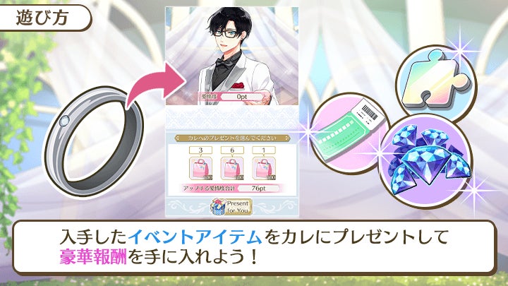 お仕事をクリアして「ブーケ」を集め、お気に入りのカレにプレゼントして豪華報酬を手に入れましょう!