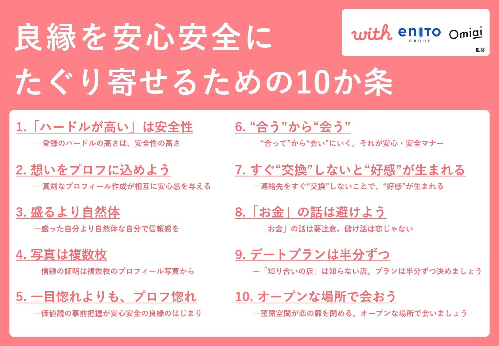 そこで、安心・安全な出会いを支援している『エニトグループ』は、安全に利用できるマッチングアプリの見分け方から、プロフィールの作り方、デート時に気を付けることなど、これからマッチングアプリの利用を検討している方や始めて間もない方に向けたガイドライン「良縁を安心安全にたぐり寄せるための10か条」を作成し、発表することといたしました。
