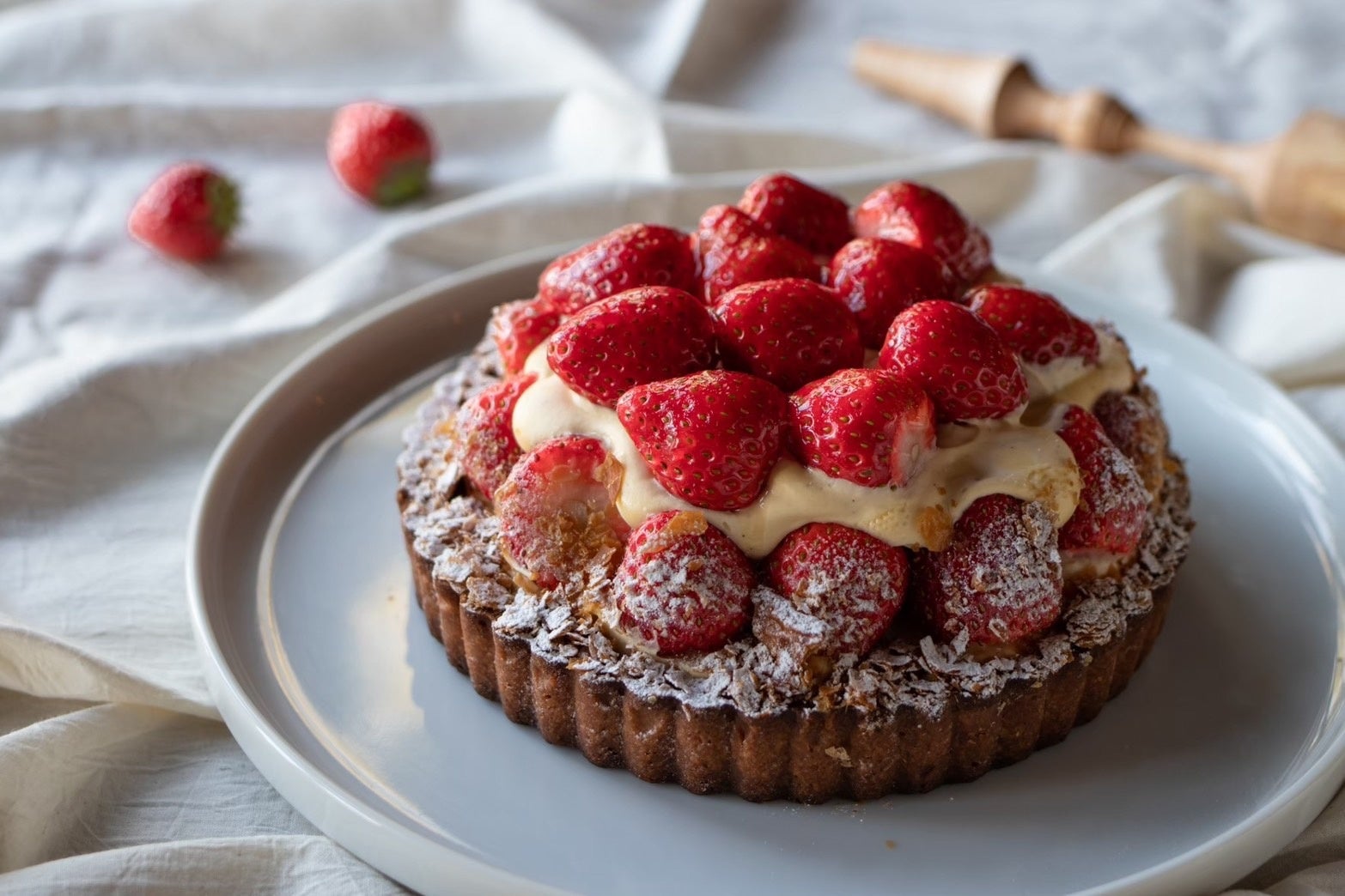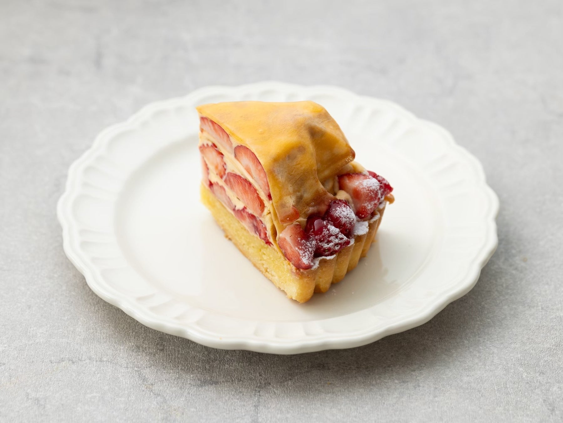 3層のクレープ生地とその間に挟まれた旬の国産いちごとムースリーヌを贅沢に使用しました。サクサクとしたタルトの食感とミルクレープの相性が楽しめる一品です。