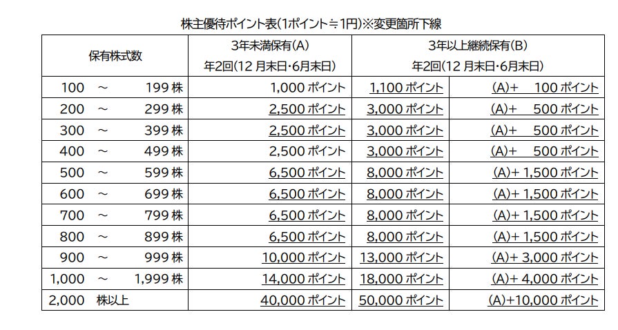 進呈条件:2023年以降、毎年12月末日、6月末日の株主名簿にそれぞれ、1単元(100株)以上