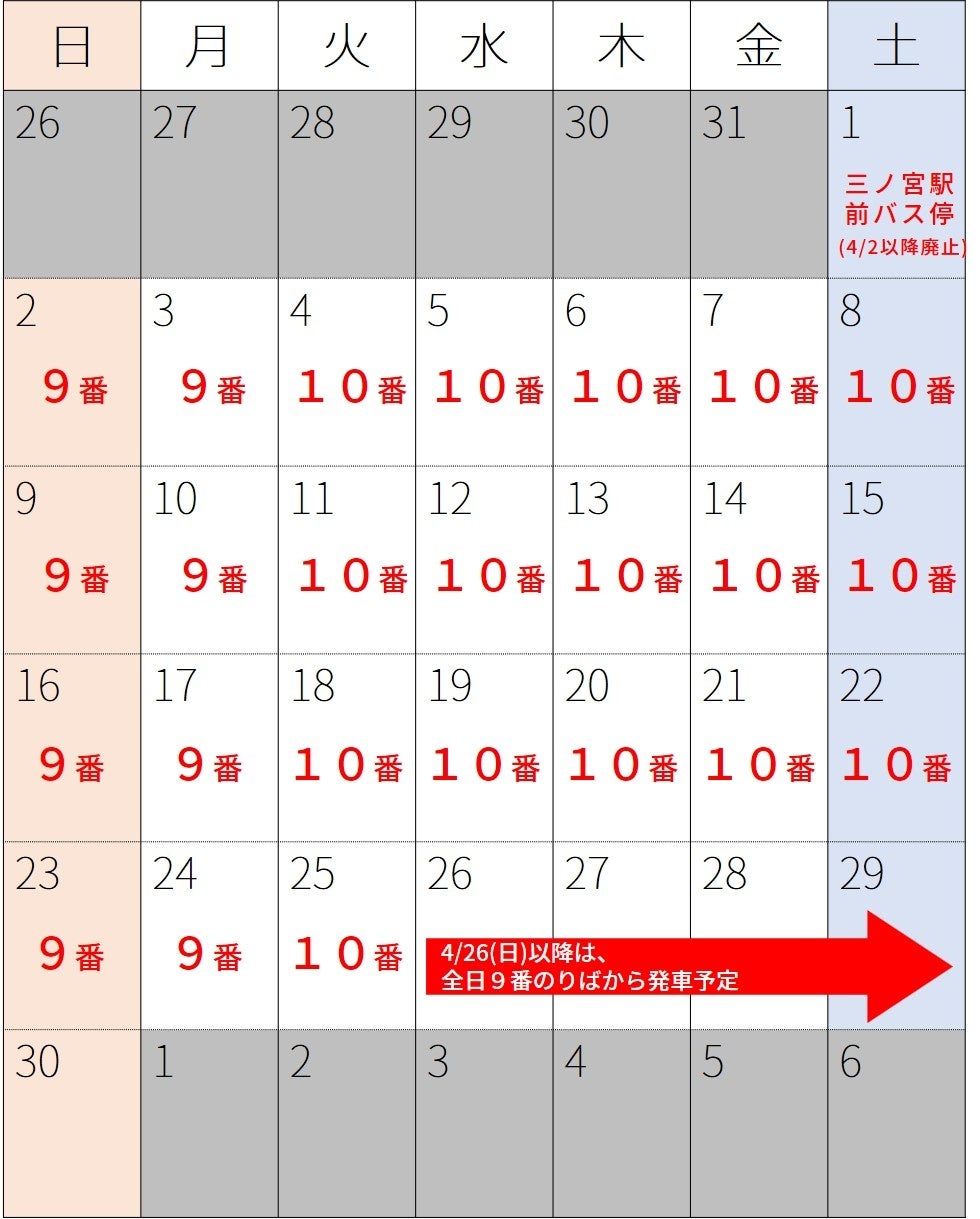 ※4/25(火)の午前00:30発車分までは、日によって9番のりばと10番のりばが異なります。