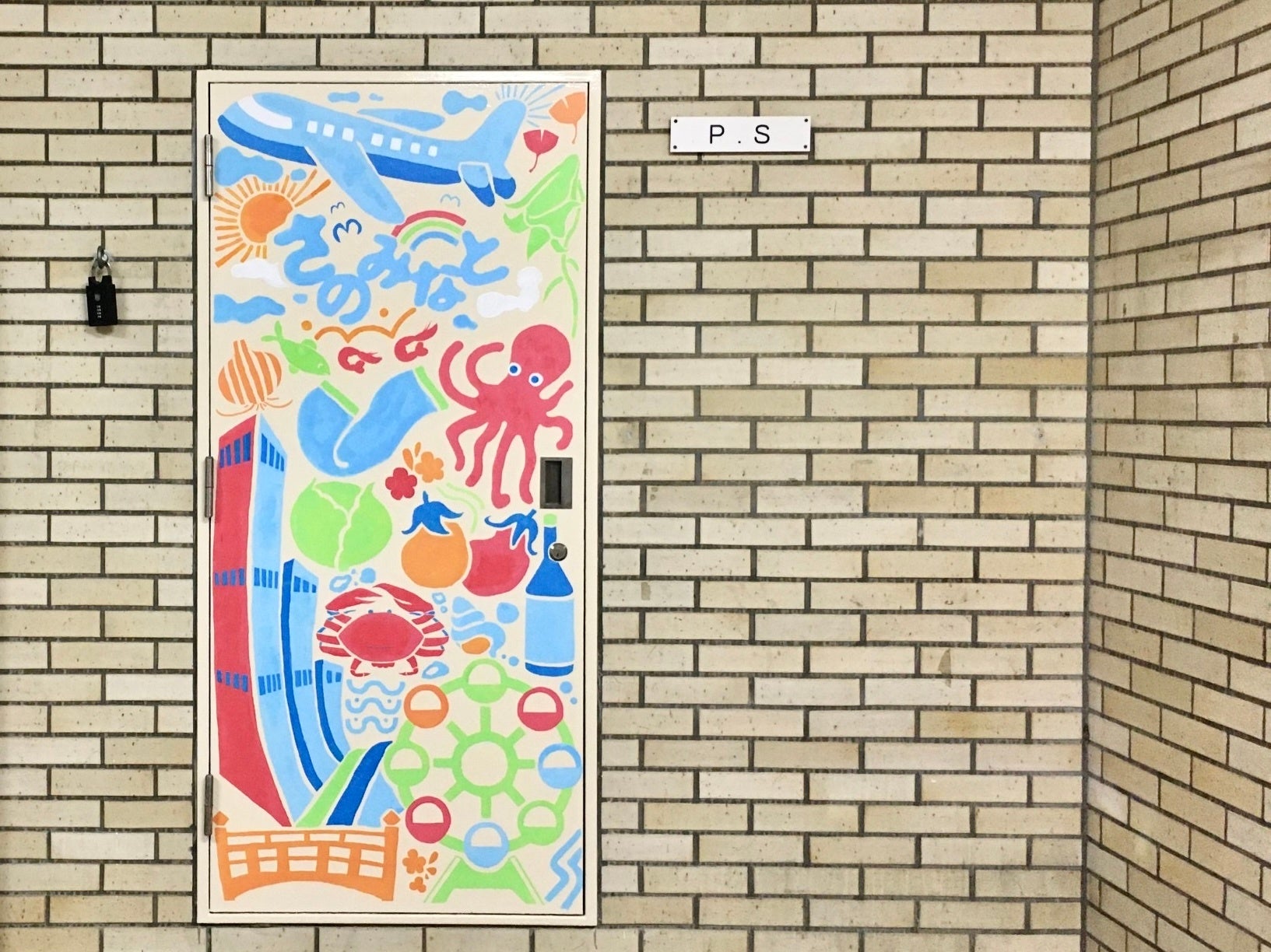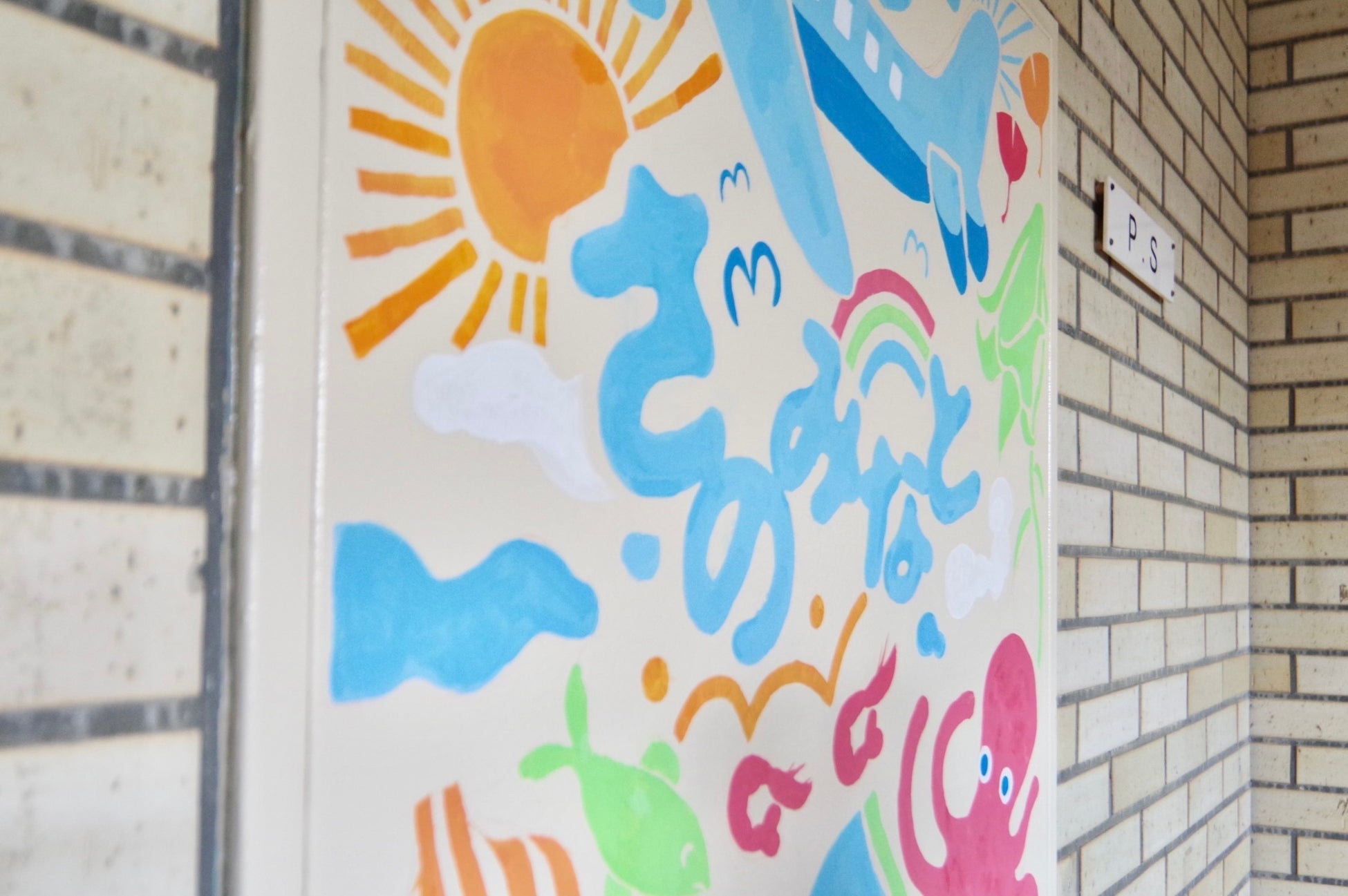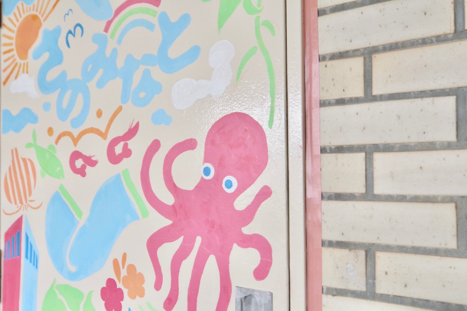 総戸数329戸、2棟からなるさのみなと団地の一角にて、ウォールアートプロジェクトを実施しました。1979年築、築45年を迎える団地の新たな価値を創出する試みの第一弾として実施。1号棟のパイプスペース扉を利用して、クリエイターの方に制作いただきました。