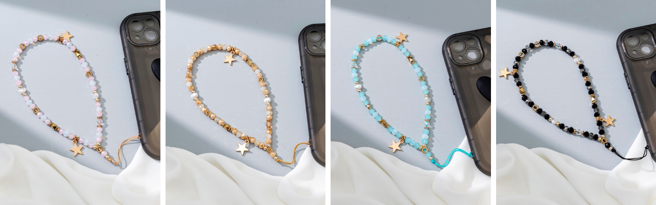⑥「高級感のある」落下防止ビーズストラップ 各 1,380円(税込)