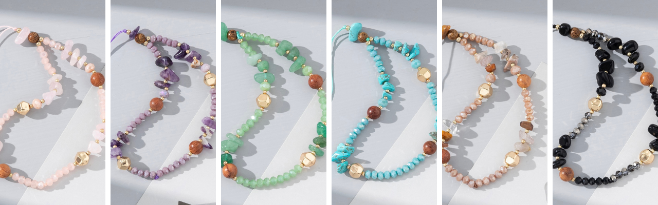 ①「天然石が魅力的」落下防止ビーズストラップ 各 1,380円(税込)
