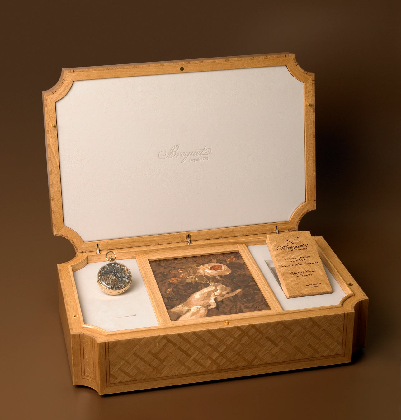 ヴェルサイユ宮殿内プチ・トリアノン宮にあったオークの木をマリー・アントワネットは大切にしていました。この木が2000年代前半に落雷にあい、切り落とされることになりました。そこで、プチ・トリアノン宮の修復事業に財政援助をしていたブレゲ社にこの木が提供され、それを使ってこのBOXが製作されました。