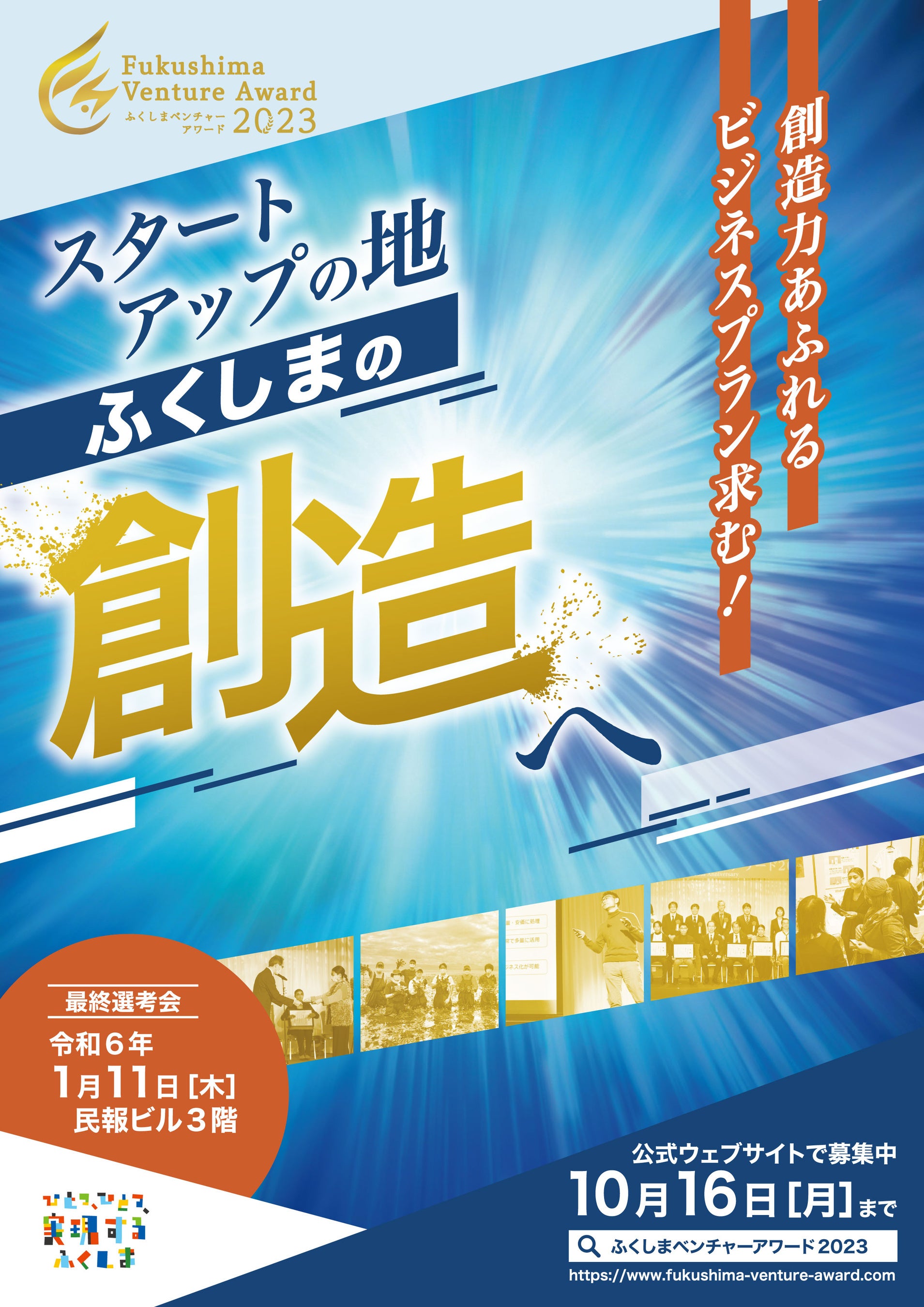 福島県は、県内で創業・起業した方及び目指す方を対象に、「ふくしまベンチャーアワード2023」を開催します。本アワードは、県内における新しいビジネスへの挑戦、地域課題の解決に取り組むビジネスプランを広く募集し、表彰する事業です。福島県知事賞をはじめとする各賞の授与のほか、審査途中には事業の発展、拡大につながるメンタリングなどの支援を実施します。