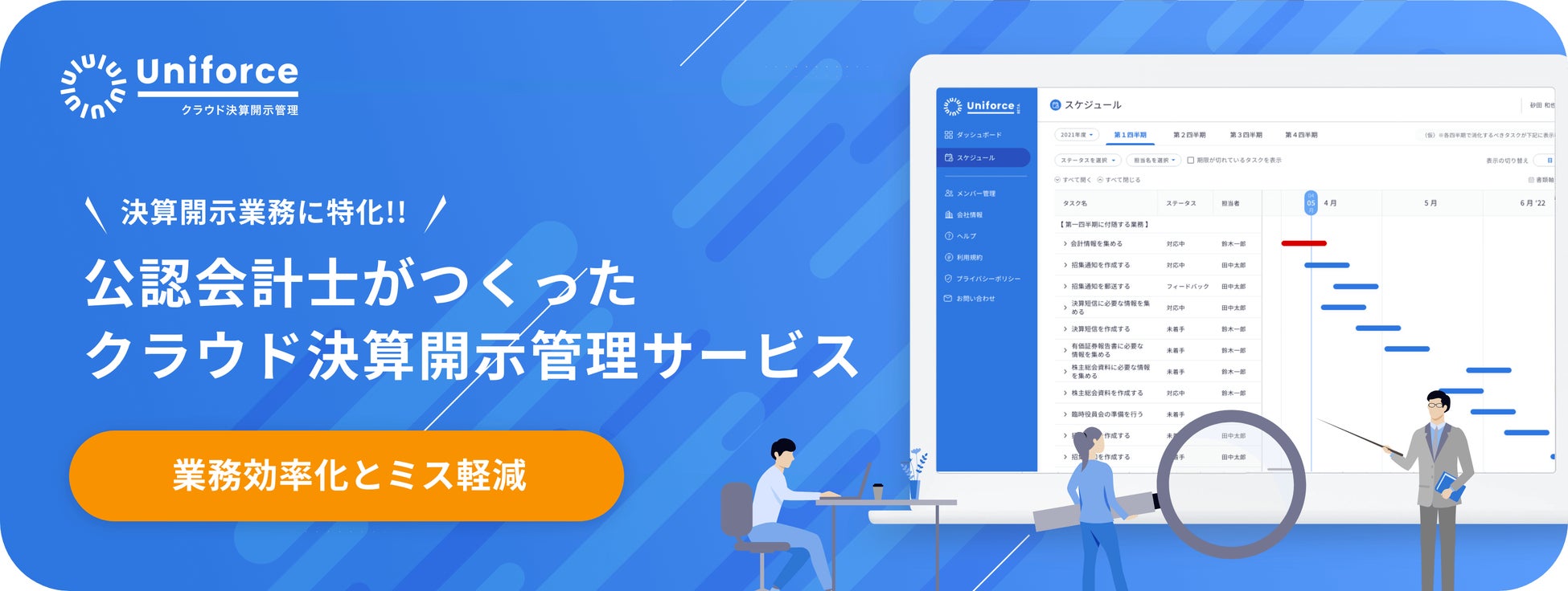 これまで数多くのIPO準備支援をしてきた公認会計士が設計したIPO準備に特化したサービスで、業務の効率化とリスクマネジメント管理を行うことができます。