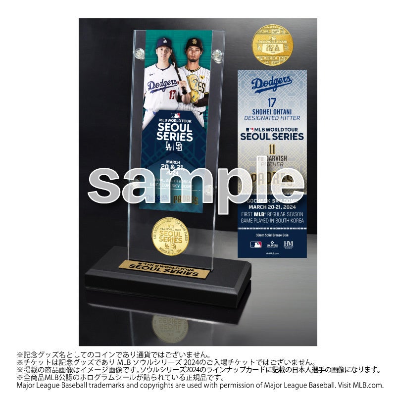 ドジャース 大谷翔平、パドレス ダルビッシュ有らの写真を使用したデザインチケットと、ソウルシリーズの大会ロゴがデザインされたコインが付属したアクリルスタンドです。