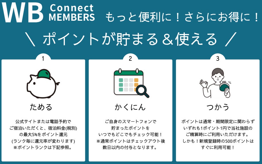 「WB Connect MEMBERS」は、ご予約いただいたご宿泊料金が会員ランクに応じて最大5%のポイントとして還元されるプログラムです。貯まったポイントは、次回以降のご宿泊時のお支払いに1ポイント=1円としてご利用いただけます。