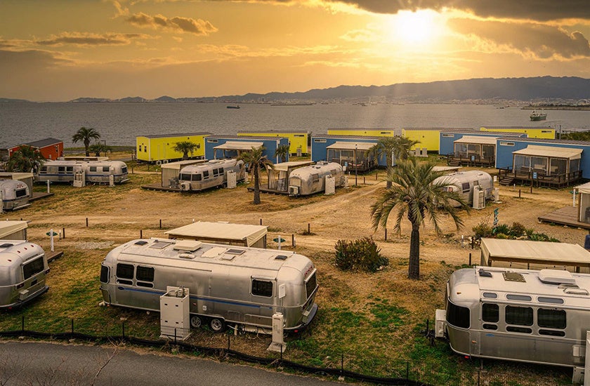 パームガーデン舞洲(大阪府大阪市):大阪湾を望む絶好のロケーションで、マイアミ・テイストのトレーラーハウスやエアストリームに宿泊できるグランピング施設。