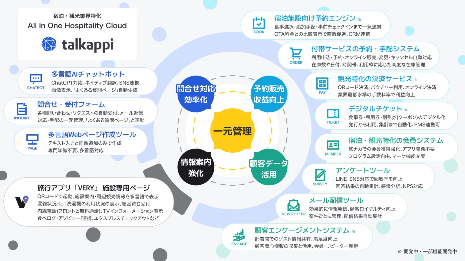 「talkappi」は、株式会社アクティバリューズ(本社:東京都渋谷区、代表取締役:陳 適)が宿泊施設や観光事業者向けに、問合せ対応・情報案内・会員管理・予約・決済など、ゲスト応対と施設運営に必要な機能をオールインワンで提供するクラウドサービスです。