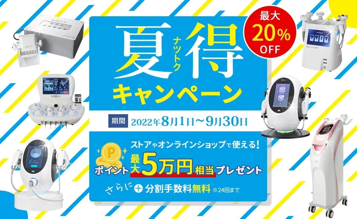 【夏得キャンペーン】業務用エステ機器が最大20%OFF!さらに最大5万円相当のポイントをプレゼント!今だけのお得なキャンペーン開催中!