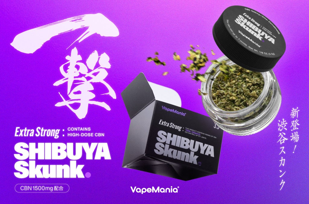 動画内で使用されたのは、VapeMania®︎のオリジナル製品「Extra Strong CBNハーブ SHIBUYA Skunk」です。