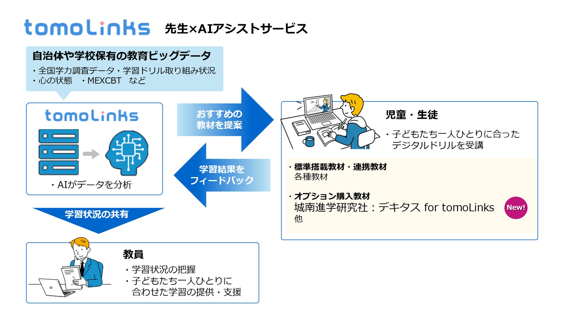 「tomoLinks」は、教育現場におけるデジタル化の支援からスタートした、社会課題の解決を目指す学習支援サービスです。「先生×AIアシスト」「学習支援」「授業診断」 の3つのサービスで構成されており、先生×AIアシストサービスは、オンライン学習教材をはじめとした様々な教育データをシームレスに利用できる国際標準規格LTI※に対応し、オンライン学習教材を 「tomoLinks」上で容易に配信・利用できる環境を提供しています。学校が所持している学カデータや自治体が実施する学力調査結果等をAIが分析し、おすすめの教材や確認テストを提供する機能を持つLTI 対応の学習プラットフォームは、「tomoLinks」が国内初です。